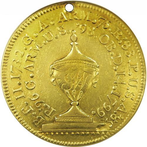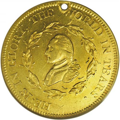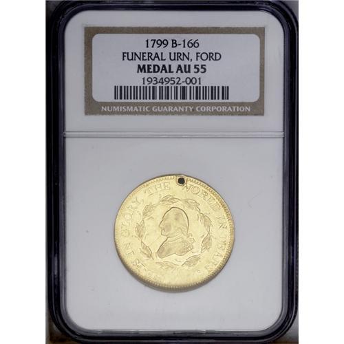<B>1799<MEDAL> Washington Funeral Urn Medal AU55 NGC.</B></I> Baker-166. Gold. Plain edge. 29.3 mm. 13.4 grams. George Washington was a favorite subject of medalists over the years, and a wide series of death medals were produced. The Funeral Urn medals were part of a series of gold, silver, and tin medals produced by Perkins. This example is from the comprehensive John Ford Collection, which contained nearly two dozen such pieces.<BR> The obverse features a profile of Washington within a closed wreath, around, the inscription HE IS IN GLORY, THE WORLD IN TEARS. The reverse has a large funeral urn with script GW. The outer legend reads: B.F.11.1732 G.A.ARM.'75.R.'83.P.U.S.A.'89. The interior legend reads: R.'96 G.ARM.U.S.'98.OB.D.14.1799. This abbreviated legend essentially provides Washington's life history! In essence, it states that Washington was born on February 11, 1732, was General of the American Army from 1775 to 1783, President of the United States of America from 1789 to 1796, General of the Army of the United States in 1798 and died December 14, 1799.<BR> This is a pleasing example with reflective bright yellow-gold surfaces. A few faint hairlines and light abrasions are noted on both sides, the most significant being a thin scratch from Washington's chin. It is holed at the top as nearly always (19 of 22 funeral medals in the Ford Collection were holed). A minor planchet depression is visible at the right end of the pedestal below the urn.<BR><I>Ex: F.C.C. Boyd Estate; John J. Ford, Jr. (Stack's, 5/2004), lot 170.</B></I> <BR><BR><B>Important notice:</B> Heritage usually auctions material at the rate of 200-250 lots per hour. On some occasions eBay Live bid software or the Internet may not be able to keep up with the pace of the auction. We recommend placing a realistic absentee bid now as insurance to avoid disappointment. Occasionally the auctioneer may eliminate or reject an eBay Live bid, and the auctioneer may also reopen a lot after the close of the eBay live bidding (usually because we missed an audience bid), and may reject your bid even if it shows you as the winning bidder. By bidding via eBay Live, you agree that Heritage may award the lot to another bidder at its sole discretion under the circumstances described above or any other reasonable circumstances. Since eBay bids are not shown to us until we open the lot on the floor, we treat those bids just like floor bids. In most cases the floor responds before the eBay bid is presented to us, due to Internet lag time, so for consistency we have made it a policy that floor bids are always considered first over tie eBay live bids. Also please note that all Heritage lots purchased through eBay Live carry a 20% Buyer's Premium. Please make sure you read the Terms and Conditions before you bid. This lot is being auctioned in conjunction with a live floor auction by Heritage Galleries & Auctioneers. All final auction and invoice information will be supplied by Heritage Galleries & Auctioneers, and all other information should be considered preliminary. Lot:198 <BR><BR><B>Winning Notification and Billing:</B> After the FINAL session in this auction is complete, Heritage will send e-mail and snail mail invoices. This process normally takes several days. All final auction and invoice information will be supplied by Heritage Galleries & Auctioneers, and all other information should be considered preliminary. <BR><BR>This auction will be conducted on a live auction floor and over the Internet through eBay Live. If you choose to place an absentee bid, please take a moment to <font color='#0000ff'><u><a href='http://pages.ebay.com/liveauctions/help/before/laabsentee.html'>learn how eBay Live absentee bidding works</a></u></font><font color='#000000'>