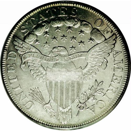 <B>1799<img border='0' src='http://www.heritagecoins.com/images/star.gif' width=10 height=10>$1> 8x5 Stars AU50 PCGS.</B></I> B-23, BB-159, R.3. This remarkable mispunching differs on the stars on both sides. Normally the left side has seven stars, not eight. The right side usually has six stars, not five. Bowers suggests the die sinker may have just finished cutting a die for the ten dollar, all of which have this 8x5 arrangement. This is a pleasing, well centered example that is brilliant throughout. The highpoints show just a trace of friction. There are no adjustment marks on this piece, and abrasions are limited to what one would normally expect for a coin that has seen 10 points of circulation.