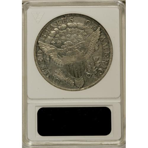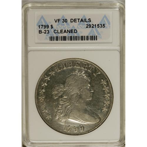 <B>1799 S$1 8x5 Stars--Cleaned--ANACS. VF30 Details.</B></I> B-23, BB-159, R.4. A lightly toned and moderately hairlined piece with pleasing sharpness on the scroll and wings. Mostly cream-gray, with traces of tan toning here and there. The only dies for the 8x5 Stars variety, which commands a premium in the <I>Guide Book.</B></I><BR><BR><b>Shipping:</b> Coin/Currency (<a target="_blank" href="http://www.heritageauctions.com/common/shipping.php">view shipping information</a>)