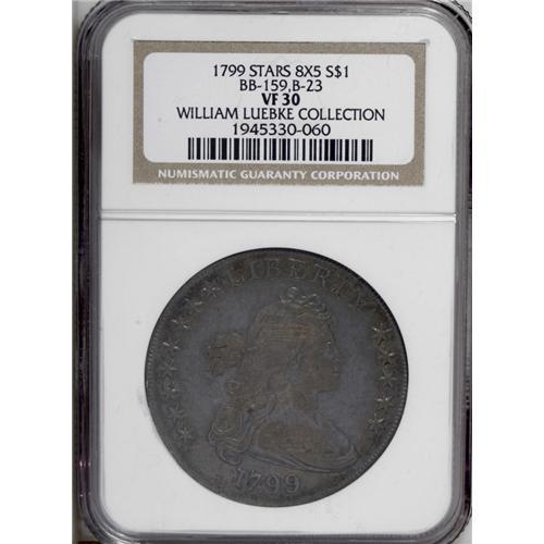 <B>1799 S$1 8x5 Stars VF30 NGC.</B></I> B-23, BB-159, R.4. Die State II. Reiver Die State a. This is an important type or <I>Guide Book</B></I> variety with an unusual obverse star arrangement. It is the only Draped Bust silver dollar with eight stars left and just five right, similar to certain early gold pieces. The obverse has a crack through B of LIBERTY and another from the border to star 10 (mislabeled star 9 in the Bowers <I>Encyclopedia.</B></I> Intermingled blue-gray, gold, and iridescent toning on each side. Myriad abrasions and faint hairlines with a rim bruise at star 4 on the obverse and another over T of UNITED on the reverse. Although a few Mint State pieces are known, this example is typical of most survivors. Although this is not a rarity in terms of the variety, enough additional demand is created by the <I>Guide Book</B></I> listing that this die marriage is highly popular and seldom available.<BR><I>Ex: Harry Laibstain (8/2005).</B></I><BR><I>From The William Luebke Collection.</B></I><BR><BR><b>Shipping:</b> Coin/Currency (<a target="_blank" href="http://www.heritageauctions.com/common/shipping.php">view shipping information</a>)
