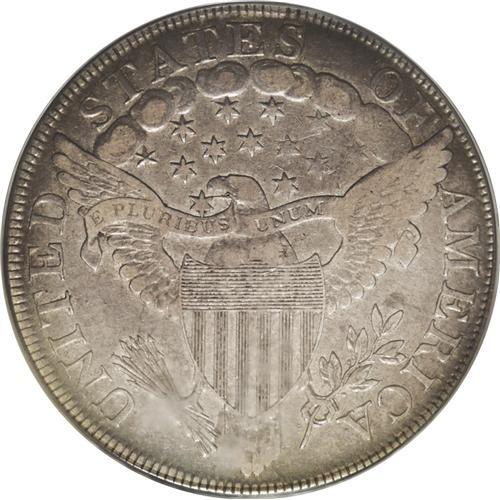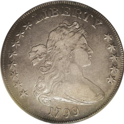 <B>1799<img border='0' src='http://www.heritagecoins.com/images/star.gif' width=10 height=10>$1> 8x5 Stars VF30 PCGS.</B></I> B-23, BB-159, R.4. This <I>Guidebook</B></I> variety is the only die marriage which has just five stars on the right side of the obverse, while eight stars are crowded along the left border. This is a pleasing, mid-grade example that shows medium gray toning in most of the recessed areas with lighter tan accents over the higher portions of the design elements. A lightly abraded and pleasingly original early dollar, this popular variety should bring a premium.