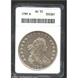 1799 S$1 AU50 ANACS.<p>B-9, BB-166. R.1. Die State V. A second example of the popular "Apostrophe" variety and a late die state. The surfaces display light silvery-golden color with light rub on the highpoints.From the Michael Hering Collection. Important notice: We expect to be auctioning lots at the rate of 200-250 per hour. Sometimes eBay Premier live bid software cannot keep up with that pace, so we strongly recommend that you place a realistic proxy bid now as insurance to avoid disappointment. Also please note that all Heritage/CAA lots purchased through eBay Premier carry a 20% Buyer's Premium.