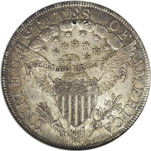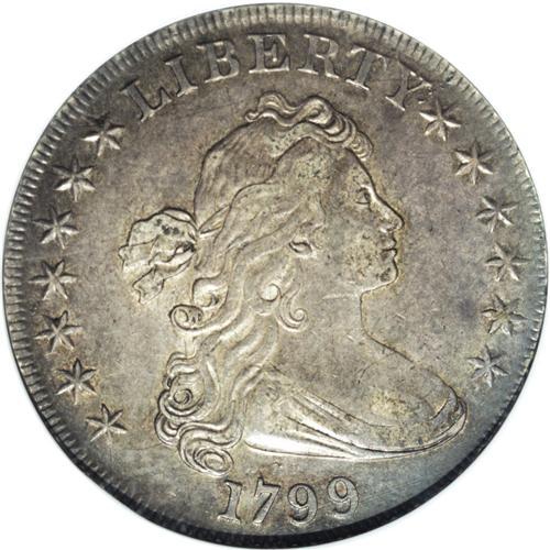 <B>1799 S$1 AU50 NGC.</B></I> B-10, BB-163, R.2. Intermediate Die State III-IV. This piece has bold definition and rich olive-gray toning. The fields are splendidly smooth, and luster emerges when the piece is rotated beneath a light. Two small marks are noted on the clouds under ES of STATES.<BR><BR><b>Shipping:</b> Coin/Currency (<a target="_blank" href="http://www.heritageauctions.com/common/shipping.php">view shipping information</a>)