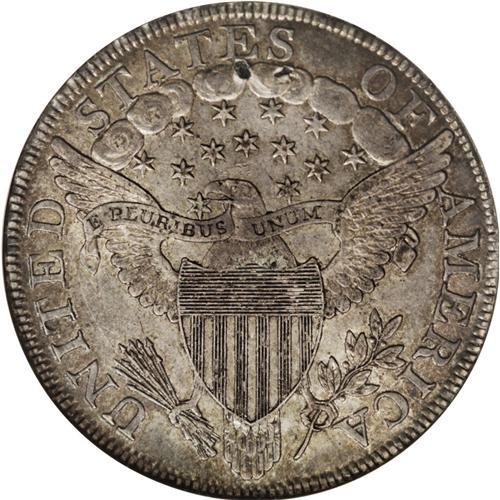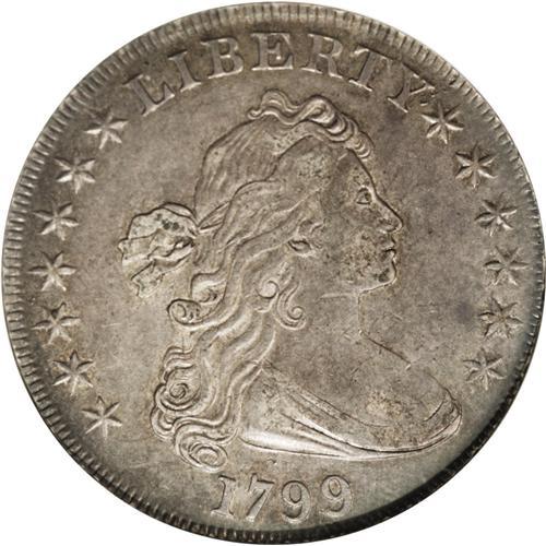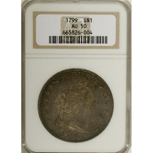 <B>1799 S$1 AU50 NGC.</B></I> B-10, BB-163, R.2. Intermediate Die State III-IV. This piece has bold definition and rich olive-gray toning. The fields are splendidly smooth, and luster emerges when the piece is rotated beneath a light. Two small marks are noted on the clouds under ES of STATES. While the obverse crack has extended to star 10, the reverse cracks enumerated in Bowers-Borckardt are not yet visible.<BR><BR><b>Shipping:</b> Coins & Currency (<a target="_blank" href="http://www.heritageauctions.com/common/shipping.php">view shipping information</a>)