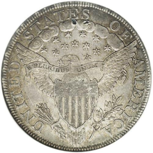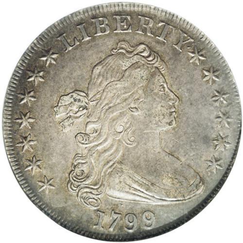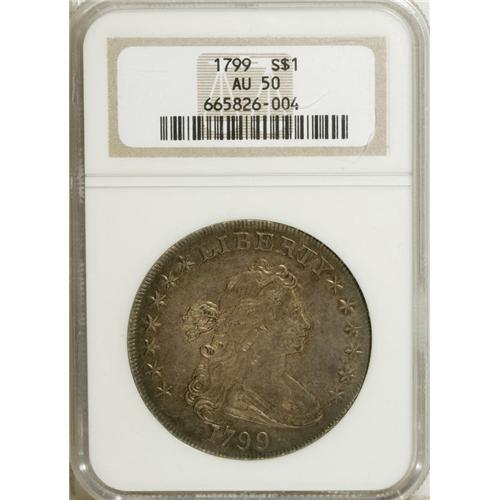 <B>1799 S$1 AU50 NGC.</B></I> B-10, BB-163, R.2. Intermediate Die State III-IV. This piece has bold definition and rich olive-gray toning. The fields are splendidly smooth, and luster emerges when the piece is rotated beneath a light. Two small marks are noted on the clouds under ES of STATES. While the obverse crack has extended to star 10, the reverse cracks enumerated in Bowers-Borckardt are not yet visible.<BR><BR><b>Shipping:</b> Coins & Currency (<a target="_blank" href="http://www.heritageauctions.com/common/shipping.php">view shipping information</a>)