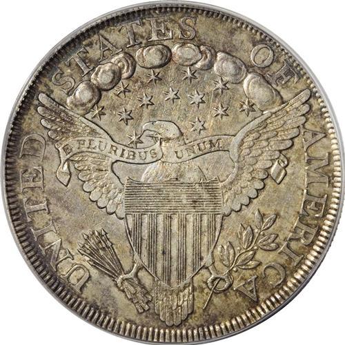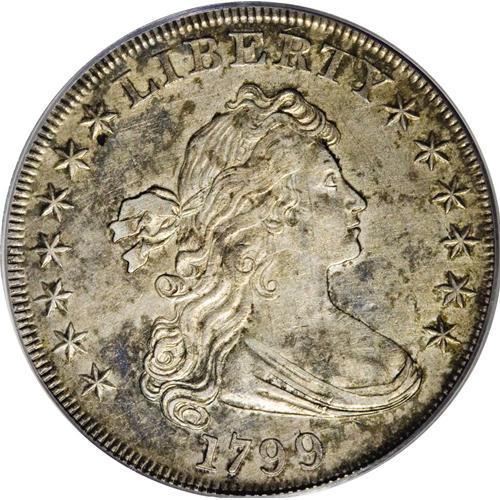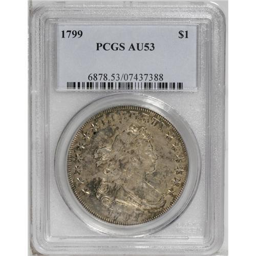 <B>1799<img border='0' src='http://www.heritagecoins.com/images/star.gif' width=10 height=10>$1> AU53 PCGS.</B></I> B-7, BB-156, R.4, Die State I. This is a much scarcer die state than is usually seen on the 1799 Bolender-7 silver dollar. A relatively easy die marriage to obtain in VF and XF grades, B-7 is scarce in AU. Wholly original, this coin is toned in dappled copper-gray shades with a base of slate-gray color peering through in certain areas. The strike is well centered and remarkably sharp for the type, although we do note some softness of detail over the central obverse highpoints and the eagle's head on the reverse. An important bidding opportunity for the Draped Bust dollar variety specialist.