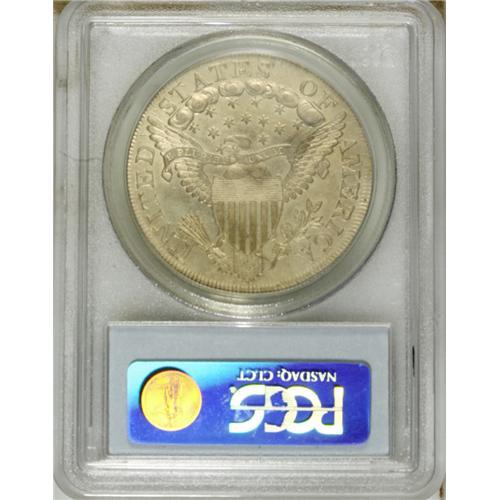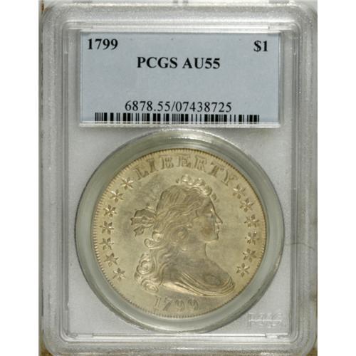 <B>1799 S$1 AU55 PCGS.</B></I> B-9, BB-166, R.1. Die State V. The reverse die is usually (but not always) identified by the die chip to the right of the final S, an instant attribution characteristic for this die variety. This is an example of the latest described die state with the obverse shattered, showing numerous die cracks. Both sides of this piece have attractive ivory color with nearly complete satin luster. While a few Mint State coins do exist, high quality survivors are not often seen. This piece is a splendid and desirable example.<BR><BR><b>Shipping:</b> Coins & Currency (<a target="_blank" href="http://www.heritageauctions.com/common/shipping.php">view shipping information</a>)