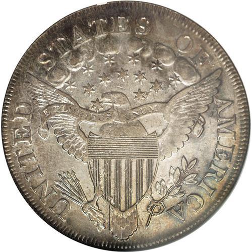 <B>1799<img border='0' src='http://www.heritagecoins.com/images/star.gif' width=10 height=10>$1> AU58 NGC.</B></I> B-21, BB-169, R.3. Star 2 is repunched, and die flaws show below the AM of AMERICA. This still-lustrous example is uniformly bold and exhibits delicate dove-gray, sky-blue, and golden-orange patina particularly around the peripheral devices on the reverse. Just the slightest wear separates this impressive Heraldic Eagle dollar from Mint State.