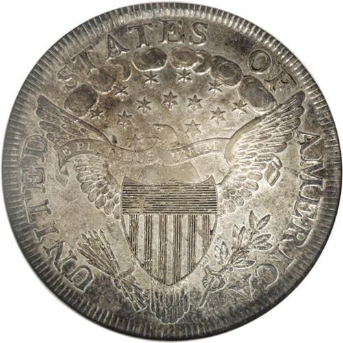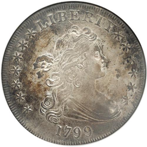 <B>1799<img border='0' src='http://www.heritagecoins.com/images/star.gif' width=10 height=10>$1> AU58 NGC.</B></I> B-5, BB-157, R.2. Die cracks through UNITED and STATES help to confirm the variety. Relatively smooth surfaces display attractive orange and grayish patination, and traces of luster in some of the recessed areas. The design elements are nicely centered on the planchet, and the dentilation is bold on both sides. Sharp definition is apparent on the motifs, though the eagle's breast feathers are weak. Tiny abrasions in the right (facing) obverse field, and an inoffensive pinscratch concealed within Liberty's hair, are mentioned solely for accuracy. <BR><BR><B>Important notice:</B> Heritage usually auctions material at the rate of 200-250 lots per hour. On some occasions eBay Live bid software or the Internet may not be able to keep up with the pace of the auction. We recommend placing a realistic absentee bid now as insurance to avoid disappointment. Occasionally the auctioneer may eliminate or reject an eBay Live bid, and the auctioneer may also reopen a lot after the close of the eBay live bidding (usually because we missed an audience bid), and may reject your bid even if it shows you as the winning bidder. By bidding via eBay Live, you agree that Heritage may award the lot to another bidder at its sole discretion under the circumstances described above or any other reasonable circumstances. Since eBay bids are not shown to us until we open the lot on the floor, we treat those bids just like floor bids. In most cases the floor responds before the eBay bid is presented to us, due to Internet lag time, so for consistency we have made it a policy that floor bids are always considered first over tie eBay live bids. Also please note that all Heritage lots purchased through eBay Live carry a 20% Buyer's Premium. Please make sure you read the Terms and Conditions before you bid. This lot is being auctioned in conjunction with a live floor auction by Heritage Galleries & Auctioneers. All final auction and invoice information will be supplied by Heritage Galleries & Auctioneers, and all other information should be considered preliminary. Lot:2139 <BR><BR><B>Winning Notification and Billing:</B> After the FINAL session in this auction is complete, Heritage will send e-mail and snail mail invoices. This process normally takes several days. All final auction and invoice information will be supplied by Heritage Galleries & Auctioneers, and all other information should be considered preliminary. <BR><BR>This auction will be conducted on a live auction floor and over the Internet through eBay Live. If you choose to place an absentee bid, please take a moment to <font color='#0000ff'><u><a href='http://pages.ebay.com/liveauctions/help/before/laabsentee.html'>learn how eBay Live absentee bidding works</a></u></font><font color='#000000'>