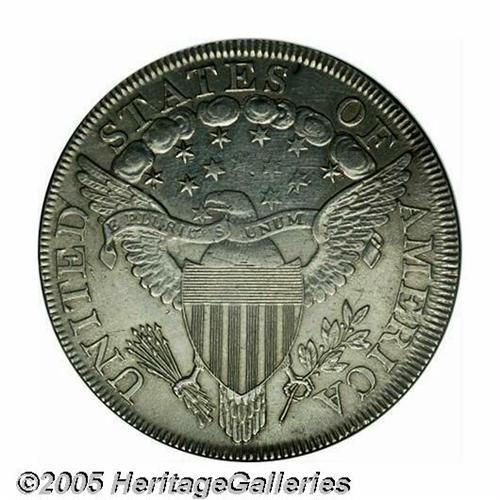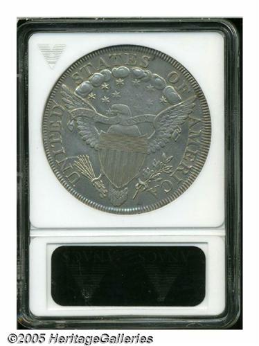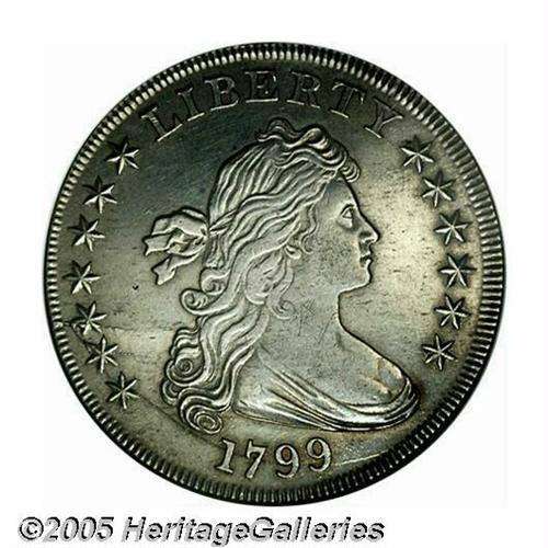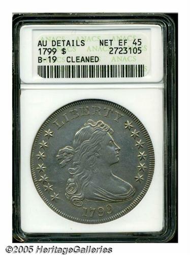 <B>1799<S$1>--Cleaned--ANACS. AU Details, Net XF45.</B></I> B-19, BB-155, R.4. Die State IV. A very difficult variety among 1799 dollars, one of only 70-110 pieces believed to exist today in all grades, according to the Bowers-Borckardt reference. Struck from a more advanced state of the dies than is normally seen, with die cracks advancing to the right from both stars 2 and 3. The surfaces are somewhat glossy from the cleaning, but still present a very nice appearance.