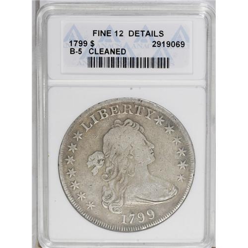 <B>1799 S$1 --Cleaned--ANACS. Fine 12 Details.</B></I> B-5, BB-157, R.2. Moderate to heavy wear is present on the luminous chalk-gray surfaces. Handling marks appear on each side, and several scratches appear around the eagle's head.<BR><BR><b>Shipping:</b> Coin/Currency (<a target="_blank" href="http://www.heritageauctions.com/common/shipping.php">view shipping information</a>)