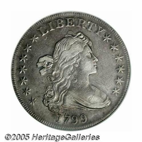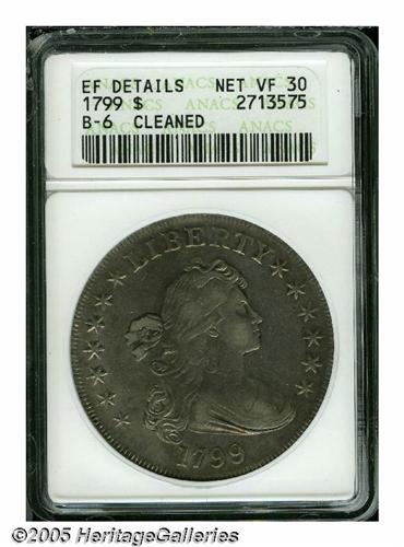 <B>1799<S$1>--Cleaned--ANACS. XF Details, Net VF30.</B></I> B-6, BB-162, R.3. Die State III. Apricot, lavender, and lime-gray colors visit but do not dominate this richly detailed Early Dollar. Wispy hairlines on the cheek and a few specks of olive debris near the eagle's head are not especially distracting. Noticeable luster frequents the devices and margins.<BR><I>From the Dr. Kurt Peters Collection.</B></I> From the Dr. Kurt Peters Collection.