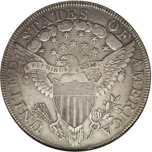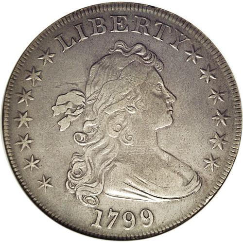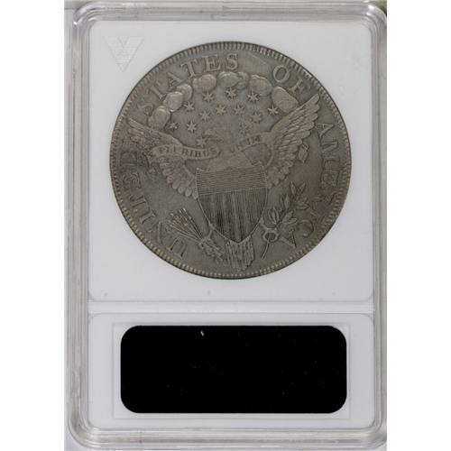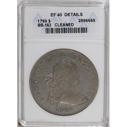 <B>1799<img border='0' src='http://www.heritagecoins.com/images/star.gif' width=10 height=10>$1>--Cleaned--ANACS. XF40 Details.</B></I> B-10, BB-163, R.2. Die State III-IV. This bold Draped Bust dollar features consistent, deep cream-gray toning. A strong glass locates faint marks on Liberty's forehead and neck, but the fields and eagle are surprisingly smooth. Early dollars have a compelling, inarguable appeal to even non-specialist collectors.