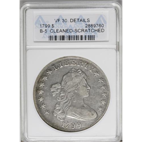 <B>1799 S$1 --Cleaned, Scratched--ANACS. VF30 Details.</B></I> B-5, BB-157, R.2. This pale gray piece is cloudy from a cleaning, and the right obverse field has a pair of noticeable pinscratches. Shorter and less prominent thin marks are noted on Liberty's head. A relatively sharp example of the popular early large silver type.<BR><BR><b>Shipping:</b> Coin/Currency (<a target="_blank" href="http://www.heritageauctions.com/common/shipping.php">view shipping information</a>)