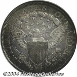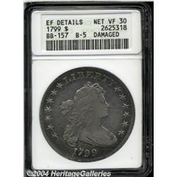<B>1799<S$1> --Damaged. ANACS.-- XF Details, Net VF-30.</B></I> B-5, BB-157. This is one of the most common of all 1799 silver dollar varieties, from a "workhorse" obverse die that was utilized with six different reverse dies. This is the often seen middle die state (state III) of this variety. While ANACS described this coin as damaged, what we see is a highly attractive example with natural pewter gray coloration, framed by attractive iridescent peripheral toning. The surfaces have light abrasions, and the damage noted by ANACS is merely some small rim imperfections on the reverse at 3 o'clock, in addition to two short scratches on the reverse near the arrowheads. <BR><BR><B>Important notice:</B> Heritage usually auctions material at the rate of 200-250 lots per hour. On some occasions eBay Live bid software or the Internet may not be able to keep up with the pace of the auction. We recommend placing a realistic absentee bid now as insurance to avoid disappointment. Occasionally the auctioneer may eliminate or reject an eBay Live bid, and the auctioneer may also reopen a lot after the close of the eBay live bidding (usually because we missed an audience bid), and may reject your bid even if it shows you as the winning bidder. By bidding via eBay Live, you agree that Heritage may award the lot to another bidder at its sole discretion under the circumstances described above or any other reasonable circumstances. Since eBay bids are not shown to us until we open the lot on the floor, we treat those bids just like floor bids. In most cases the floor responds before the eBay bid is presented to us, due to Internet lag time, so for consistency we have made it a policy that floor bids are always considered first over tie eBay live bids. Also please note that all Heritage lots purchased through eBay Live carry a 20% Buyer's Premium. Please make sure you read the Terms and Conditions before you bid. </span></font></tr></table></td></tr></table>