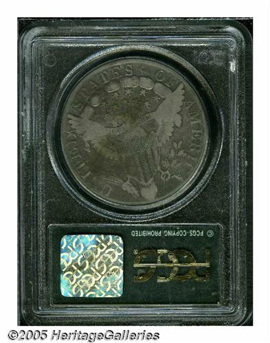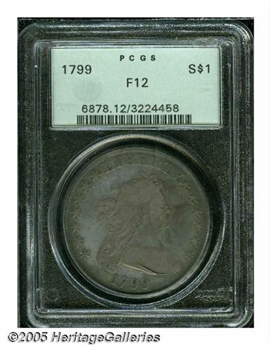 <B>1799<S$1> Fine 12 PCGS.</B></I> B-11, BB-161, R.2. Deep violet-grey and olive example of this issue. Worn, but free of serious distractions, the eagle's head is particularly weak. The present variety is noted for the die-clash marks above the date.