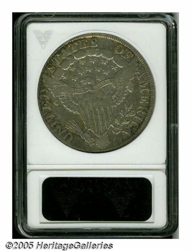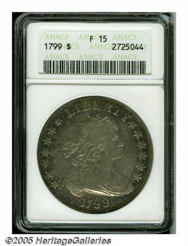 <B>1799<S$1> Fine 15 ANACS.</B></I> B-16, BB-158, R.3. While perhaps the most plentiful die state of this variety, it is also by far the most interesting. The obverse was struck from a buckled and shattered die, the result being an extensive network of cracks and a slight bulge along the lower portion. The surfaces are a pleasing medium-gray with deeper blue and golden color about the borders, particularly on the obverse.
