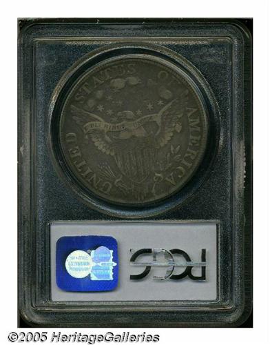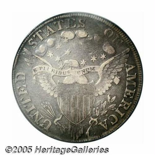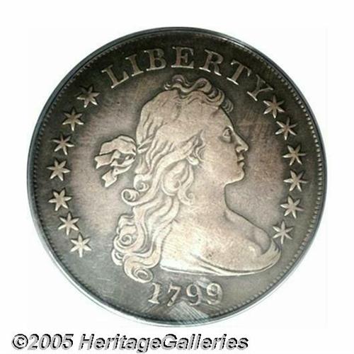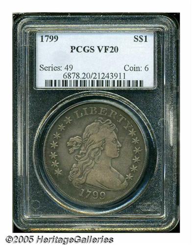 <B>1799<S$1> Irregular Date VF20 PCGS.</B></I> B-15, BB-152, R.4. A so-called irregular date variety, which has a somewhat askew date logotype. The Blundered Stars Reverse, which has a pair of reverse stars partly imbedded into the clouds. There is also a heavy die break from the stem of the olive branch to the rim. Both sides have olive-gray patina that outlines the devices, with the surfaces otherwise subtle rose in color. A nicely detailed example that has problem free surfaces.