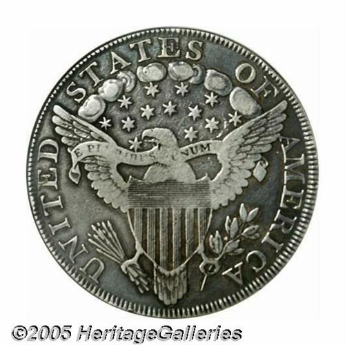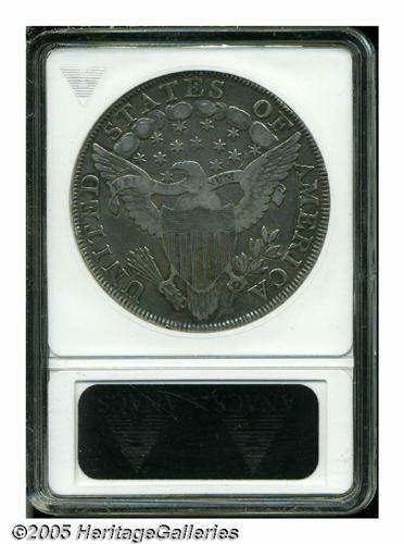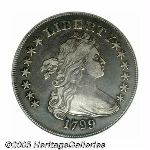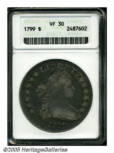 <B>1799<S$1> Irregular Date VF30 ANACS.</B></I> B-13, BB-151, R.5. This "Irregular Date" variety is very rare and seldom seen in the marketplace. Bowers estimates that only 40-75 pieces are believed extant today in all grades, most of which are clustered in the VF grade range. This variety is distinguished by a speck of die rust above the E in STATES and die flaws between and under the two lower stars on the far right. This piece's unnatural brightness from cleaning has been greatly subdued by the deep gray and blue toning in the fields and within the devices. The highpoints are gray-brilliant, providing strong contrast on each side. The most obvious mark is a long, shallow scratch below the IB in LIBERTY. A very rare opportunity for the early Dollar specialist.