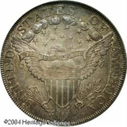 1799 S$1 MS62 PCGS. B-9, BB-166, R.1. Die State II <B>1799 S$1 MS62 PCGS.</B></I> B-9, BB-166, R.1. Die State II, with a short die crack halfway from the denticles to the base of the 1 in the date. The so-called "Apostrophe" variety with a die flaw seen after the final S in STATES. The obverse and the reverse of this coin are toned a medium steel-gray color with rose undertones. Also, a plethora of multicolored iridescence is seen as the coin is rotated under a light source. There is an area of weakness of strike at the central portion of the reverse, typical for this die variety and typical for the assigned grade. This is one of the finest known specimens of 1799 B-9, BB-166, and the single finest we have offered. <BR><BR><B>Important notice:</B> Heritage usually auctions material at the rate of 200-250 lots per hour. On some occasions eBay Live bid software or the Internet may not be able to keep up with the pace of the auction. We recommend placing a realistic absentee bid now as insurance to avoid disappointment. Occasionally the auctioneer may eliminate or reject an eBay Live bid, and the auctioneer may also reopen a lot after the close of the eBay live bidding (usually because we missed an audience bid), and may reject your bid even if it shows you as the winning bidder. By bidding via eBay Live, you agree that Heritage may award the lot to another bidder at its sole discretion under the circumstances described above or any other reasonable circumstances. Since eBay bids are not shown to us until we open the lot on the floor, we treat those bids just like floor bids. In most cases the floor responds before the eBay bid is presented to us, due to Internet lag time, so for consistency we have made it a policy that floor bids are always considered first over tie eBay live bids. Also please note that all Heritage lots purchased through eBay Live carry a 20% Buyer's Premium. Please make sure you read the Terms and Conditions before you bid. This lot is being auctioned in conjunction with a live floor auction by Heritage Galleries & Auctioneers. All final auction and invoice information will be supplied by Heritage Galleries & Auctioneers, and all other information should be considered preliminary. Lot:6372