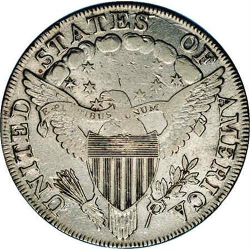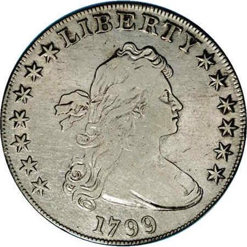 <B>1799<S$1> Normal Date. B-8, BB-165, R.2--Improperly Cleaned--NCS. VF Details.</B></I> Inner point of star 10 doubled; N of UNITED repunched over inverted N. Reiver die state b. Bowers-Borckardt die state III. This is the Reiver plate coin for the variety, both obverse and reverse. Cleaned to an unnatural brightness and with moderate hairlines on the surfaces. A later die state with the crack from the seventh star through LIBE clear, on the reverse there are extensive cracks and clash marks as noted in the Reiver reference (and others). Weakly impressed on the stars over the eagle, typical for this later die state. The surfaces are fairly average for the grade, and this one is identifiable by a small scrape at the central upper point of the shield. .<BR><I>Ex: Taggart (November, 1976).</B></I> Envelope Included.