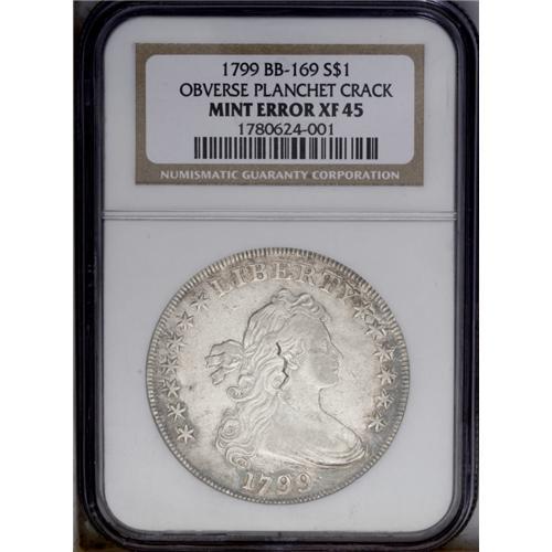 <B>1799<img border='0' src='http://www.heritagecoins.com/images/star.gif' width=10 height=10>$1>--Obverse Planchet Crack--XF45 NGC.</B></I> B-21, BB-169, R.3. A rising die crack from the rim through the 99 in the date to the bust helps identify the die variety. A fissure-like crack is present to the left of Liberty's ear, and was caused at the moment of striking. This Heraldic Eagle dollar exhibits substantial luster for the designated grade, and the only mentionable marks are relegated to the upper left reverse. <BR><BR><B>Important notice:</B> Heritage usually auctions material at the rate of 200-250 lots per hour. On some occasions eBay Live bid software or the Internet may not be able to keep up with the pace of the auction. We recommend placing a realistic absentee bid now as insurance to avoid disappointment. Occasionally the auctioneer may eliminate or reject an eBay Live bid, and the auctioneer may also reopen a lot after the close of the eBay live bidding (usually because we missed an audience bid), and may reject your bid even if it shows you as the winning bidder. By bidding via eBay Live, you agree that Heritage may award the lot to another bidder at its sole discretion under the circumstances described above or any other reasonable circumstances. Since eBay bids are not shown to us until we open the lot on the floor, we treat those bids just like floor bids. In most cases the floor responds before the eBay bid is presented to us, due to Internet lag time, so for consistency we have made it a policy that floor bids are always considered first over tie eBay live bids. Also please note that all Heritage lots purchased through eBay Live carry a 20% Buyer's Premium. Please make sure you read the Terms and Conditions before you bid. This lot is being auctioned in conjunction with a live floor auction by Heritage Galleries & Auctioneers. All final auction and invoice information will be supplied by Heritage Galleries & Auctioneers, and all other information should be considered preliminary. Lot:2138 <BR><BR><B>Winning Notification and Billing:</B> After the FINAL session in this auction is complete, Heritage will send e-mail and snail mail invoices. This process normally takes several days. All final auction and invoice information will be supplied by Heritage Galleries & Auctioneers, and all other information should be considered preliminary. <BR><BR>This auction will be conducted on a live auction floor and over the Internet through eBay Live. If you choose to place an absentee bid, please take a moment to <font color='#0000ff'><u><a href='http://pages.ebay.com/liveauctions/help/before/laabsentee.html'>learn how eBay Live absentee bidding works</a></u></font><font color='#000000'>