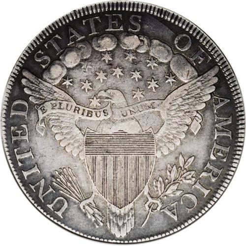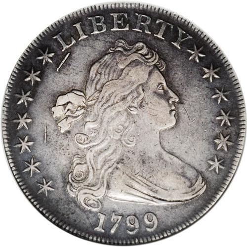 <B>1799<img border='0' src='http://www.heritagecoins.com/images/star.gif' width=10 height=10>$1 --Obverse Scratched--ANACS. XF45 Details.</B></I> B-10, BB-163, R.2. Die State III. A richly defined dove-gray representative of this familiar variety, identified by the lengthy and slightly curved stem on the olive branch. A few short obverse scratches, but only the one beneath the L in LIBERTY is deep enough to merit mention. The reverse is clean aside from a light horizontal mark above the arrow heads.
