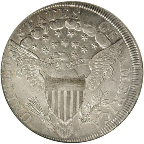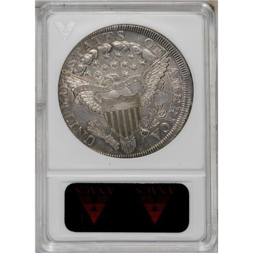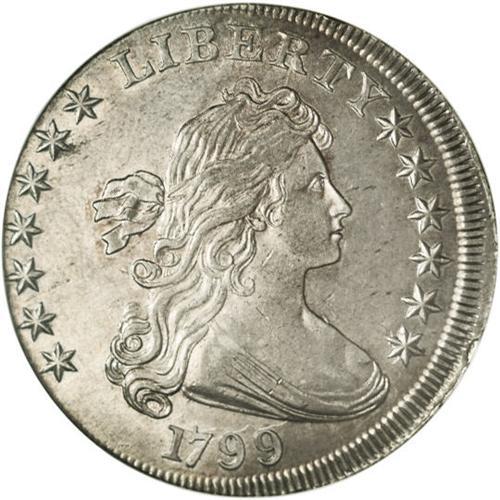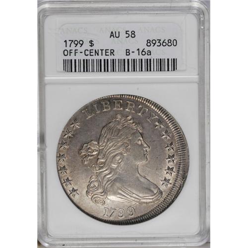 <B>1799<img border='0' src='http://www.heritagecoins.com/images/star.gif' width=10 height=10>$1>--Off-Center--AU58 ANACS.</B></I> B-16a, BB-158, R.2. Approximately 5% off-center at 9 o'clock. Die State III with prominent clash marks visible on both sides. Those on the reverse include the entire date located behind ES and right of the final S. (Hint: To see these date marks clearly, look at the reverse upside down with the coin inverted.) Not only is this an impressive example of high quality, virtually Mint State, but it is also an important off-center example, more than just a poorly centered example. This coin is far enough off-center to qualify as a mint error. The left obverse and reverse design elements, including the stars and tops of the letters, run off the edge of the planchet. The surfaces have nearly full luster with pale gold and light gray color.<BR><I>From The Royal Oak Collection.</B></I>