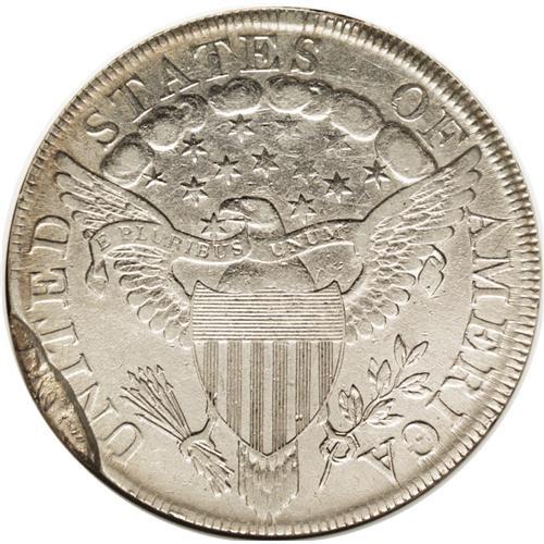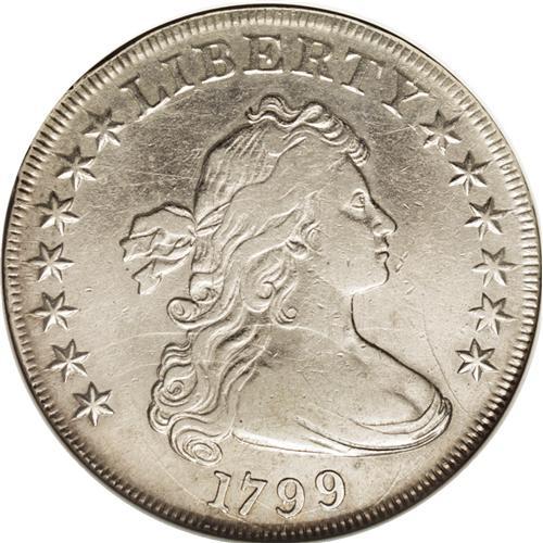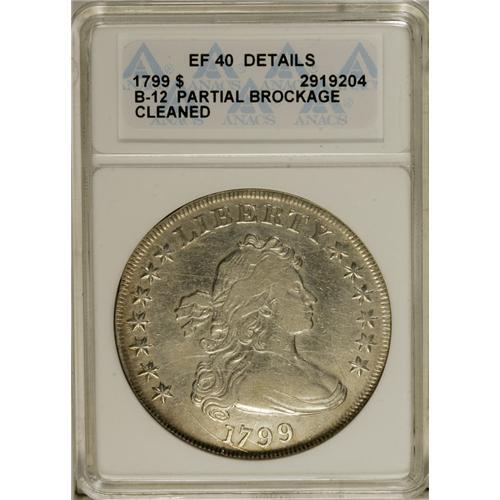 <B>1799 S$1 --Partial Brockage, Cleaned--ANACS. XF40 Details.</B></I> B-12, BB-160, R.3. Bowers-Borckardt Die State III. The reverse has a 5% strike-through near 8 o'clock. This interesting strike-through is presumably a brockage from a previously struck coin that failed to fully eject before the present piece was struck. Some design detail (a leaf and lettering) is visible on the partial brockage. A piece worthy of study by the devoted specialist. A subdued slate-gray example with glimpses of luster in protected areas such as the hair and plumage. A pale gray spot above the left (facing) wingtip is lightly tooled.<BR><BR><b>Shipping:</b> Coin/Currency (<a target="_blank" href="http://www.heritageauctions.com/common/shipping.php">view shipping information</a>)