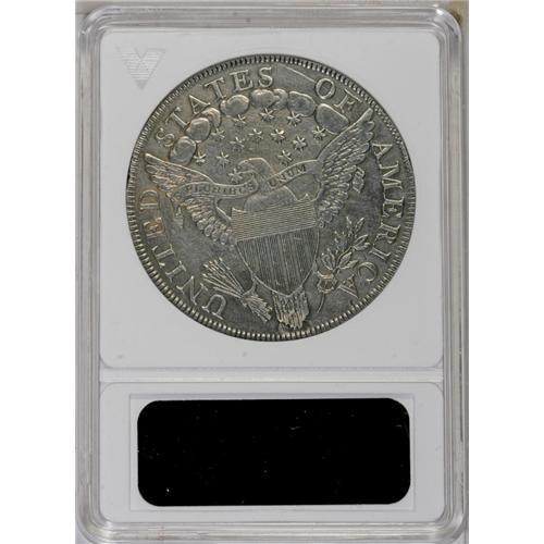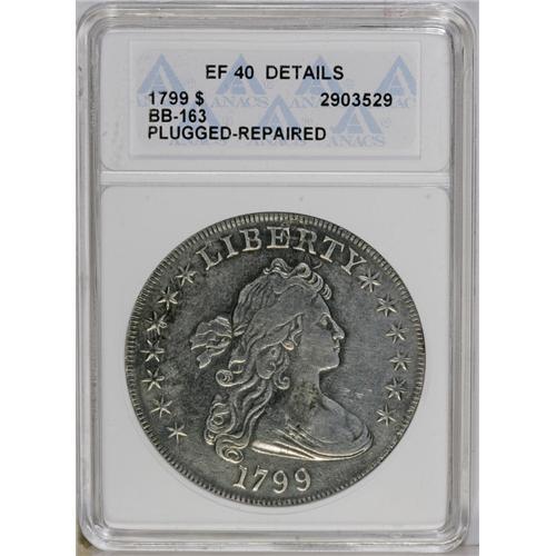 <B>1799<img border='0' src='http://www.heritagecoins.com/images/star.gif' width=10 height=10>$1>--Plugged, Repaired--ANACS. XF40 Details.</B></I> B-10, BB-163, R.2. A hole near the rim at 12 o'clock on the obverse has been plugged and the missing details added. Lightly worn with slick charcoal-gray surfaces that show evidence of past cleaning.