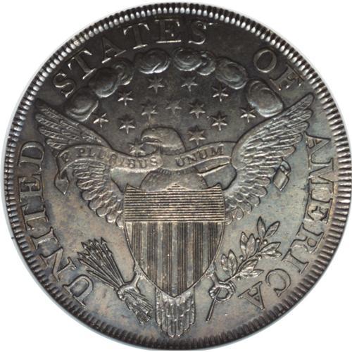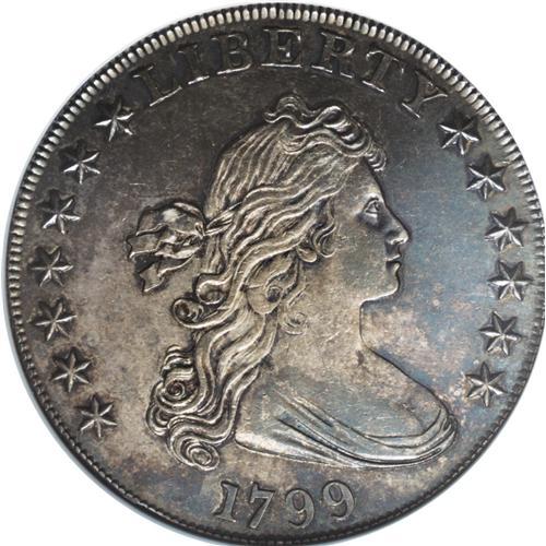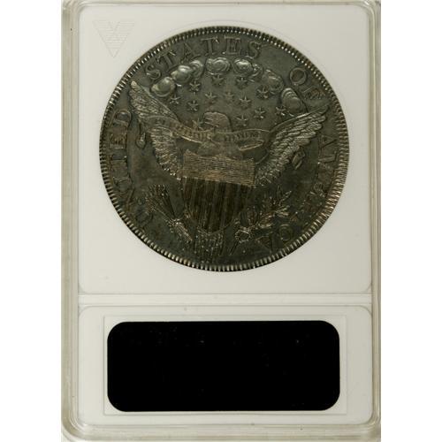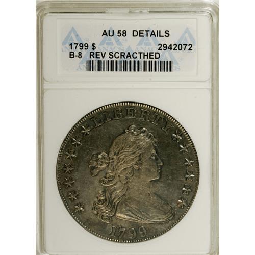 <B>1799 S$1 --Reverse Scratched--ANACS. AU58 Details.</B></I> B-8, BB-165, R.3. Die State I. This is an early die state with a few reverse die flaws, especially through the top of the final S, but with no evidence of die cracks on either side. The reverse has an oval gouge in the space to the right of the eagle's neck, apparently the reason for the notation on the holder. Otherwise, this is a remarkable, sharply struck piece with pleasing blue and iridescent toning over prooflike surfaces.<BR><BR><b>Shipping:</b> Coins & Currency (<a target="_blank" href="http://www.heritageauctions.com/common/shipping.php">view shipping information</a>)
