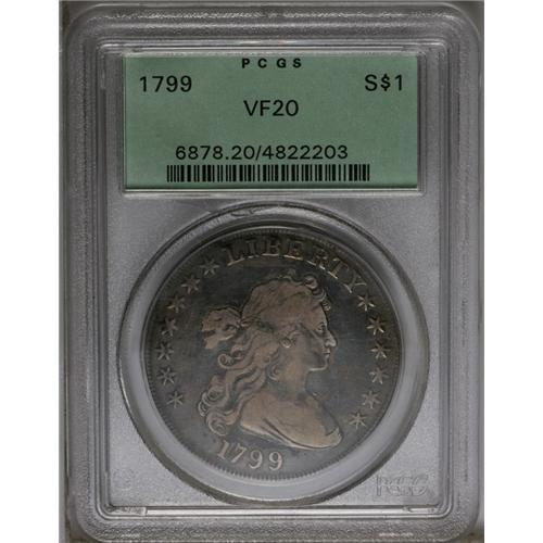 <B>1799 S$1 VF20 PCGS.</B></I> B-10, BB-163, R.2. Die State I. Reiver Die State a. Stars 1 and 13 distant, star 7 closer, star 8 closest; all six stars touch clouds, stars 2 and 5 with two points. Only two examples of Die State I are currently verified. This piece appears to represent the earliest die state with perfect obverse and reverse dies, a die state that Bowers suggested "may not exist." In fact, this die state should not exist, except here it is. There is no evidence of any die cracks on either side. This obverse die was used with six different reverse dies to strike a similar number of die marriages, with B-10 appearing late in the sequence. Mostly violet-gray on both sides with considerable steel patina on the obverse. The devices, especially on the obverse, have lighter grayish-gold color.<BR><I>Ex: eBay (1/2002).</B></I><BR><I>From The William Luebke Collection.</B></I><BR><BR><b>Shipping:</b> Coin/Currency (<a target="_blank" href="http://www.heritageauctions.com/common/shipping.php">view shipping information</a>)