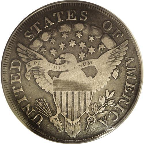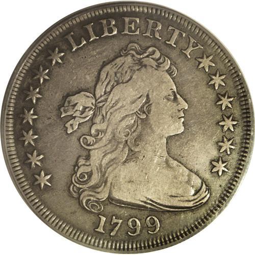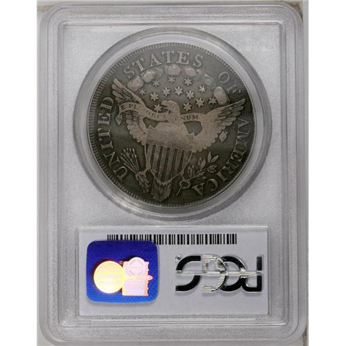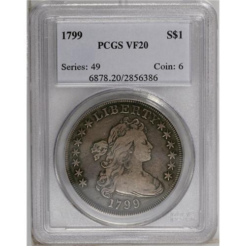 <B>1799 S$1 VF20 PCGS.</B></I> B-21, BB-169, R.3. Die State V. Reiver Die State b. Star 1 far from curl, star 8 close to Y; die flaws beneath AM. This is a relatively common variety, although apparently a rarity in the latest die state. This piece has the die cracks later than Bolender described, apparently equivalent to the 1973 Gilhousen specimen, lot 1264, although the plate of that piece is not clear enough to show all of the die cracks. This piece and the Gilhousen coin are different examples.<BR> The obverse has minor die roughness below and through star 1. A fine die crack from the border to the bust crosses the digit 7. Another crack from the border below the digit 1 crosses the first crack and continues through both 9s to the bust, where it turns upward into the field above the drapery, eventually joining star 11. A series of different cracks joins all stars on the right and continues through RTY. In addition to the identifying die flaws, the reverse is cracked from the border over F to the right wingtip and the tops of AME.<BR> Violet-gray with peripheral olive-brown, deeper on the reverse. The devices have lighter grayish color. The lower reverse fields have a number of well-hidden hairline scratches, mostly toned over and visible only with close examination.<BR><I>Ex: Coinman 1000 (9/2001).</B></I><BR><I>From The William Luebke Collection.</B></I><BR><BR><b>Shipping:</b> Coin/Currency (<a target="_blank" href="http://www.heritageauctions.com/common/shipping.php">view shipping information</a>)