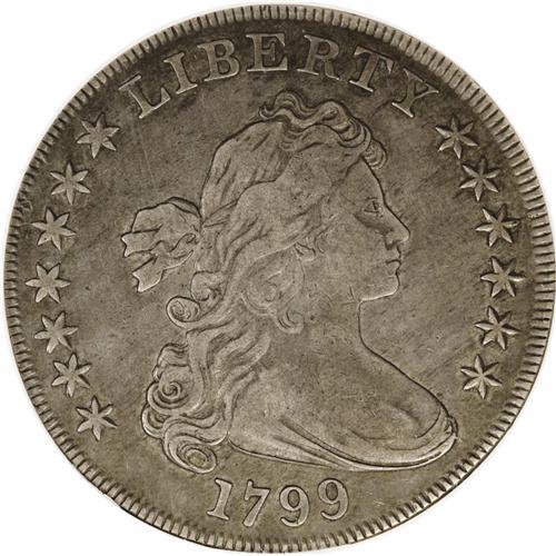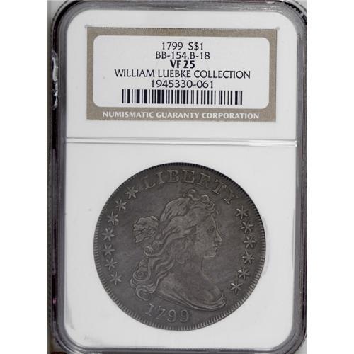 <B>1799 S$1 VF25 NGC.</B></I> B-18, BB-154, R.5. Die State II. Reiver Die State c. Curl centered under right edge of E; usually cracked between E and D. Although a few examples are known with a perfect reverse die, this variety is normally recognized by the prominent die crack from the border to the ribbon between the E and D of UNITED. Only two or three perfect-die pieces are known, including the Bowers plate coin. Capt. J.W. Haseltine gave such perfect-die coins a different number, H-20. Bolender wrote: "Haseltine's No. 20 was only a perfect die impression of No. 18, and is not a distinct die variety. Thus, No. 20 does not exist, and is now omitted to make my numbers coincide with Haseltine's." Bowers suggested that Bolender eliminated the number as non-existent, but Bolender's comments clearly indicate that he was aware of the perfect die state.<BR> Only four 1799 varieties (out of 22 total) are currently considered R.5, and this variety appears to be the second rarest of the four. In Bolender's original reference, published in 1950, the B-18 was one of just three varieties to be called R.6. Deep gray color with pleasing golden toning near the borders, especially on the reverse. Scattered circulation marks are evident on each side, yet the surfaces are clearly finer than usually seen at this grade level.<BR><I>Ex: Jim Rutherford.</B></I><BR><I>From The William Luebke Collection.</B></I><BR><BR><b>Shipping:</b> Coin/Currency (<a target="_blank" href="http://www.heritageauctions.com/common/shipping.php">view shipping information</a>)