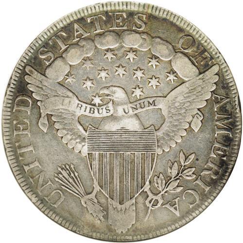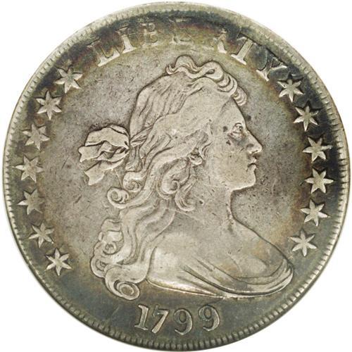 <B>1799<img border='0' src='http://www.heritagecoins.com/images/star.gif' width=10 height=10>$1> VF30 ANACS.</B></I> B-16B, BB-158, R.2. BDS IV. Numerous bold die cracks converge in Liberty's hair beneath the ribbon to confirm the late die state. A nicely detailed Bust dollar with rich golden-brown and ebony-russet toning along the borders, while the centers are medium gray in color. A couple of minor rim dings are present, and the BER in LIBERTY is unusually weak, the outcome of a failing die.