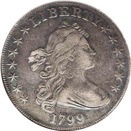 <B>1799<img border='0' src='http://www.heritagecoins.com/images/star.gif' width=10 height=10>$1> VF30 ANACS.</B></I> B-17, BB-164, R.2. This attractively detailed and glossy Heraldic Eagle dollar possesses deep lavender-gray patina. No marks are readily apparent save for a small rim nick on the reverse at 4 o'clock. Mint-made adjustment marks are faint, and relegated to the right obverse border.