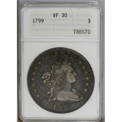 <B>1799<img border='0' src='http://www.heritagecoins.com/images/star.gif' width=10 height=10>$1> VF30 ANACS.</B></I> B-21, BB-169, R.3. Although a few faint scratches and tiny abrasions are visible, the surfaces are deeply toned with steel and gray-brown color, creating a smooth and desirable appearance and masking the few imperfections. Like others of the year, this is a plentiful variety that will appeal to a broad spectrum of collectors. <BR><BR><B>Important notice:</B> Heritage usually auctions material at the rate of 200-250 lots per hour. On some occasions eBay Live bid software or the Internet may not be able to keep up with the pace of the auction. We recommend placing a realistic absentee bid now as insurance to avoid disappointment. Occasionally the auctioneer may eliminate or reject an eBay Live bid, and the auctioneer may also reopen a lot after the close of the eBay live bidding (usually because we missed an audience bid), and may reject your bid even if it shows you as the winning bidder. By bidding via eBay Live, you agree that Heritage may award the lot to another bidder at its sole discretion under the circumstances described above or any other reasonable circumstances. Since eBay bids are not shown to us until we open the lot on the floor, we treat those bids just like floor bids. In most cases the floor responds before the eBay bid is presented to us, due to Internet lag time, so for consistency we have made it a policy that floor bids are always considered first over tie eBay live bids. Also please note that all Heritage lots purchased through eBay Live carry a 20% Buyer's Premium. Please make sure you read the Terms and Conditions before you bid. This lot is being auctioned in conjunction with a live floor auction by Heritage Galleries & Auctioneers. All final auction and invoice information will be supplied by Heritage Galleries & Auctioneers, and all other information should be considered preliminary. Lot:2133 <BR><BR><B>Winning Notification and Billing:</B> After the FINAL session in this auction is complete, Heritage will send e-mail and snail mail invoices. This process normally takes several days. All final auction and invoice information will be supplied by Heritage Galleries & Auctioneers, and all other information should be considered preliminary. <BR><BR>This auction will be conducted on a live auction floor and over the Internet through eBay Live. If you choose to place an absentee bid, please take a moment to <font color='#0000ff'><u><a href='http://pages.ebay.com/liveauctions/help/before/laabsentee.html'>learn how eBay Live absentee bidding works</a></u></font><font color='#000000'>