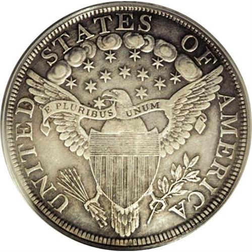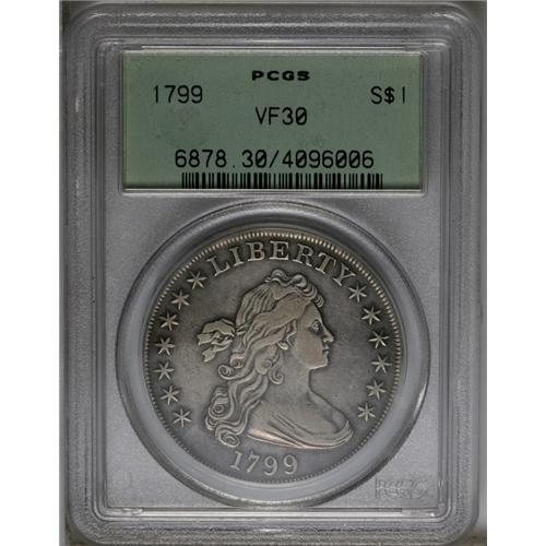 <B>1799 S$1 VF30 PCGS.</B></I> B-5, BB-157, R.2. Die State IV or later. Reiver Die State b. Stars 7 and 8 closer than stars 1 and 13; U defective, star 6 touches cloud 8 at two points. Two different reverse dies have the defective U that is missing its left outside serif. The second of these is known in two different die states, either with or without berries. Quite an attractive coin for the grade, and housed in an older green-label PCGS holder. Pewter-gray fields with deeper blue-gray color at the borders and lighter tan on the devices. A few tiny surface marks are noted on each side, as usual for the grade. Acquired from an eBay seller as part of a type set of silver dollars, including a 1795 B-15, an 1836 Gobrecht, 1847 and 1871 Seated dollars, a 1921-D Morgan, and a 1921 Peace dollar.<BR> This particular example presents some problems with the recorded die states of this variety and the emission sequence of a group of interconnected die marriages. For his B-5a die state, Bolender stated: "Obverse short die cracks from lower left corner of E down to hair, and below first star" and Jules Reiver further commented: "Crack through the point of the left dentil sic, should be serif of E down through the hair meets a crack from the dentils below star 1." No similar piece was included in the Reiver sale, and Bowers mentioned that he had not seen an example, but here it is! The problem is that this obverse continued in use for additional varieties, yet with no evidence of these so-called die cracks. We are unable to find evidence of any continuation "down through the hair" as Reiver describes. It is our belief that both of these features are actually clash marks from the tail feathers and the wing tip, and that they were later lapped from the die. The other possibility is that they are actually die cracks that were lapped away.<BR><I>Ex: eBay (3/2001).</B></I><BR><I>From The William Luebke Collection.</B></I><BR><BR><b>Shipping:</b> Coin/Currency (<a target="_blank" href="http://www.heritageauctions.com/common/shipping.php">view shipping information</a>)