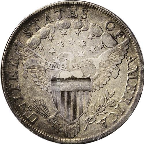 <B>1799<img border='0' src='http://www.heritagecoins.com/images/star.gif' width=10 height=10>$1> VF35 ANACS.</B></I> B-5a, BB-157, R.2. Die State II. A hairline crack runs from the rim below the stem through UNITED and the wingtip. The obverse is light silver-gold while the reverse has mellowed to a pinkish-gray. Moderate circulation wear is noted, but no overt abrasions are present.