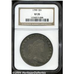 <B>1799<S$1> VF35 NGC.</B></I> B-8, BB-165, R.3. Note that on this obverse die, Liberty has an "open mouth." The 1 in the date is relatively far from the curl. The obverse die was used only to produce this variety, as was the reverse die. It is interesting to note that the N in UNITED was initially cut upside down and later corrected. The peripheral details are well defined, but some softness is noted in the centers. Richly toned with deep gray patina throughout and underlying layers of rose and orange just beneath. An attractive example with no mentionable abrasions. <BR><BR><B>Important notice:</B> Heritage usually auctions material at the rate of 200-250 lots per hour. On some occasions eBay Live bid software or the Internet may not be able to keep up with the pace of the auction. We recommend placing a realistic absentee bid now as insurance to avoid disappointment. Occasionally the auctioneer may eliminate or reject an eBay Live bid, and the auctioneer may also reopen a lot after the close of the eBay live bidding (usually because we missed an audience bid), and may reject your bid even if it shows you as the winning bidder. By bidding via eBay Live, you agree that Heritage may award the lot to another bidder at its sole discretion under the circumstances described above or any other reasonable circumstances. Since eBay bids are not shown to us until we open the lot on the floor, we treat those bids just like floor bids. In most cases the floor responds before the eBay bid is presented to us, due to Internet lag time, so for consistency we have made it a policy that floor bids are always considered first over tie eBay live bids. Also please note that all Heritage lots purchased through eBay Live carry a 20% Buyer's Premium. Please make sure you read the Terms and Conditions before you bid. </span></font></tr></table></td></tr></table>