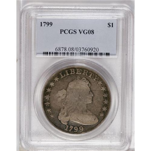 <B>1799<img border='0' src='http://www.heritagecoins.com/images/star.gif' width=10 height=10>$1> VG8 PCGS.</B></I> B-9, BB-166, R.1. Heavily worn but still legible, with gray-brown patina that darkens in a horizontal swath across the center. Pleasing for the grade.