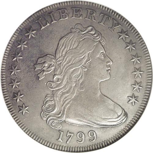 <B>1799<img border='0' src='http://www.heritagecoins.com/images/star.gif' width=10 height=10>$1>--Whizzed--ANACS. XF45 Details.</B></I> Normal Date. B-21, BB-169, R.3 The diagnostic die break through the final three digits and lower point of the bust is visible only upon close inspection. Star 2 is repunched, and die flaws show below the AM of AMERICA. Deep rose-brown color overlays the smooth, nearly abrasion-free surfaces. This is a not unattractive coin despite faint evidence of whizzing in the obverse fields, and beneath Liberty's ear. B-21 is a slightly scarcer die marriage, with 450-850 coins believed extant (per Bowers, 1993), most of which grade below XF. An affordable example with lots of remaining detail.