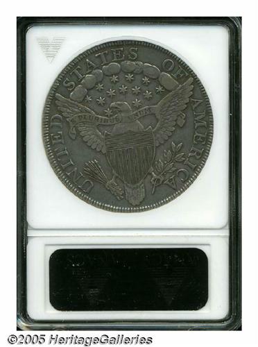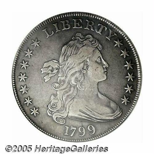 <B>1799<S$1> XF40 ANACS.</B></I> B-16, BB-158, R.3. The so-called "Close 17" obverse, the 1 and 7 in the date are much closer than on any other 1799 obverse. Toned a medium argent-gray in the recesses of the design, the more exposed areas have a slightly contrasting, silver-gray patina. Even close examination fails to reveal any major marks or other problems on either side. A smooth, ideal example for a type collection.