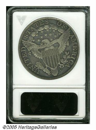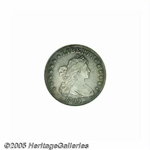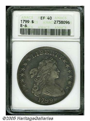 <B>1799<S$1> XF40 ANACS.</B></I> B-6, BB-162, R.3. Moderately toned in the fields and protected areas with much lighter accents over the highpoints of the devices. A few scattered abrasions are noted near the center of the obverse. The durable obverse die for Bolender-6 was eventually paired with six different reverses.