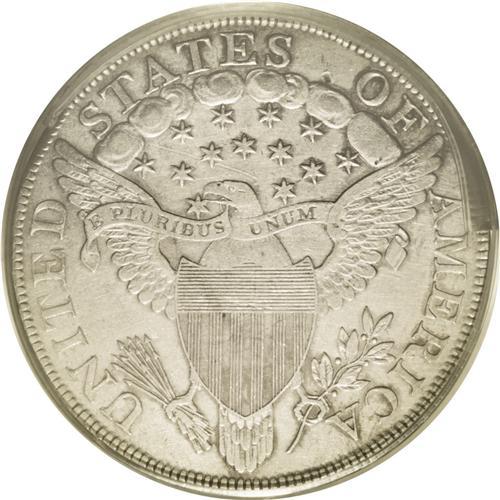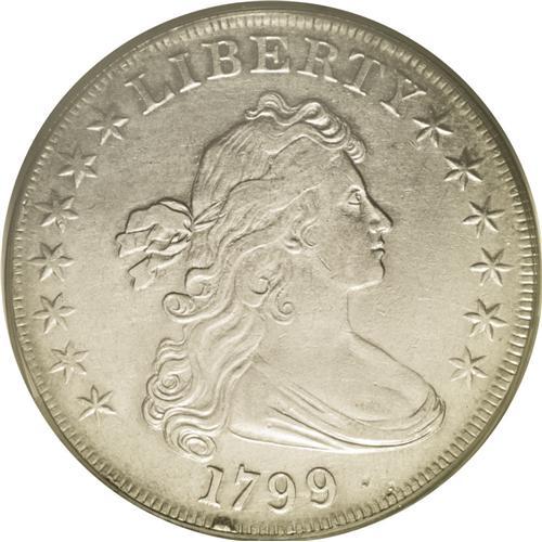 <B>1799<img border='0' src='http://www.heritagecoins.com/images/star.gif' width=10 height=10>$1> XF40 PCGS.</B></I> B-10, BB-163, R.2. This Draped Bust dollar features golden-brown borders, cream-gray fields, and dove-gray device highpoints. Luster is ample, and the strike is crisp. Light hairlines are noted near the forehead, a faded thin mark is present above the eagle's head, and a couple of moderate marks are found near the date. Housed in an old green label holder.<BR><I>Ex: Set Shahbabian, M.D. Collection (Bowers and Merena, 1/96), lot 1618.</B></I><BR><I>From The Chief Paduke Collection.</B></I>
