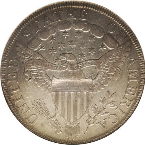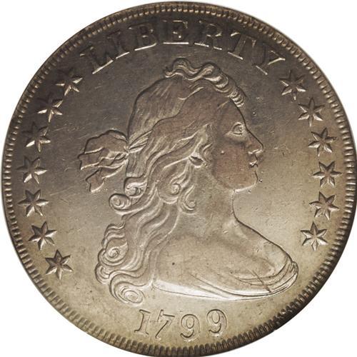 <B>1799<img border='0' src='http://www.heritagecoins.com/images/star.gif' width=10 height=10>$1> XF45 NGC.</B></I> B-12, BB-160, R.3. Light golden-brown luster bathes the devices and letters, and is considerable for the XF45 grade. The highpoints are gunmetal-gray. Small obverse rim mark are noted at 5 and 10 o'clock, a thin mark is present on the drapery, and a pinpoint dig is located near the left scroll end. None of these imperfections are apparent to the unaided eye.
