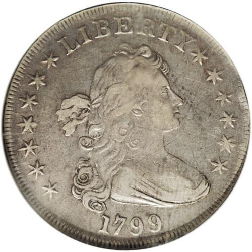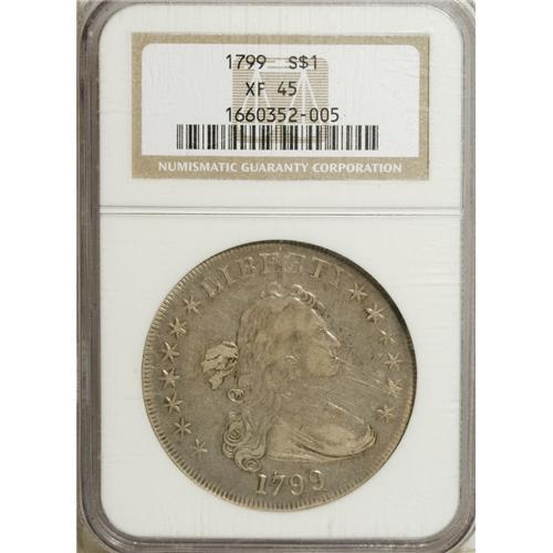 <B>1799 S$1 XF45 NGC.</B></I> B-17, BB-164, R.2. Die State III, the most commonly seen state. The variety is identified by the curious parallel lines beneath the star below the second and third clouds. This coin is a uniform medium gray in color, with light highpoint wear, and presents quite well. The strike is a bit weak through the right-side stars.<BR><BR><b>Shipping:</b> Coins & Currency (<a target="_blank" href="http://www.heritageauctions.com/common/shipping.php">view shipping information</a>)