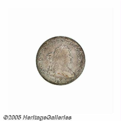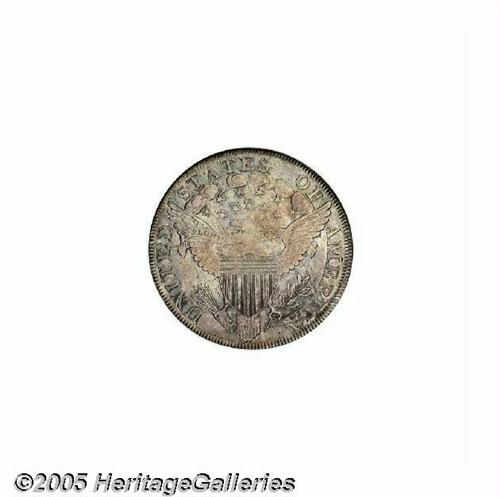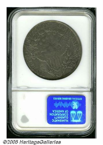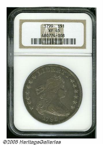 <B>1799<S$1> XF45 NGC.</B></I> B-18, BB-154, R.4. This variety is eagerly sought by specialists as one of the four rarest varieties of the 22 die marriages for 1799. The reverse is relatively easy to attribute, especially when it shows the heavy die break from the rim through E of UNITED and into the eagle's left wing to the top of the shield. Die varieties enjoy strong demand today, and this one should see spirited bidding from specialists. Complimented by its comparatively high grade, this is a very attractive example of this scarce variety. The surfaces are evenly worn and show no major impairments on either side. Medium rose-gray toning covers both obverse and reverse.