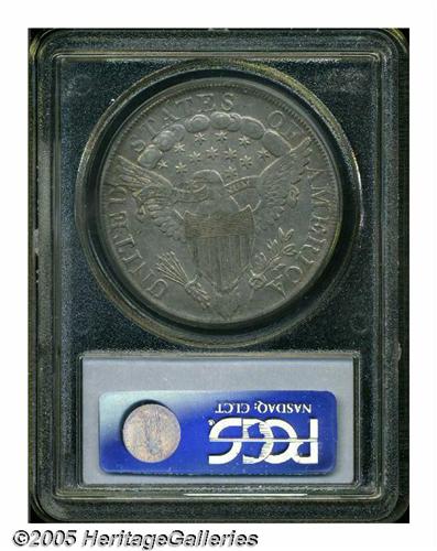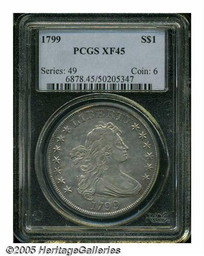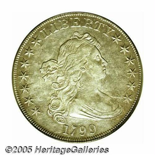 <B>1799<S$1> XF45 PCGS.</B></I> B-11, BB-161, R.2. Die State III. A 'no berries' variety, being further distinguished by a broken U in UNITED and a die crack from the reverse border just above 9 o'clock to the eagle's beak. This normally seen die state has an additional spindly die crack through the first five letters of UNITED. Some luster survives amidst moderately abraded silver-gray surfaces. Tinges of golden color are seen about the devices.