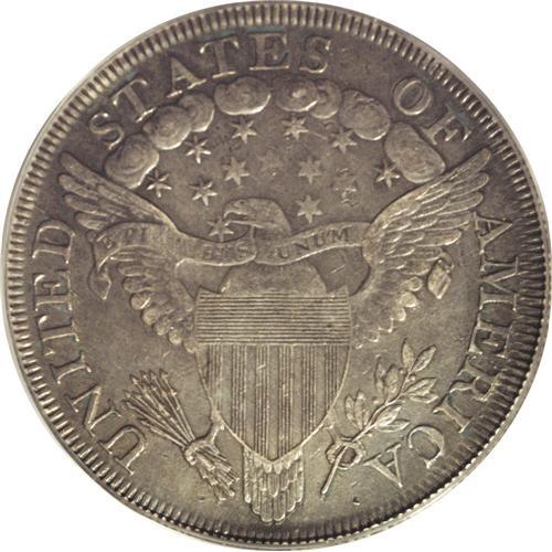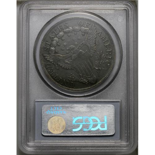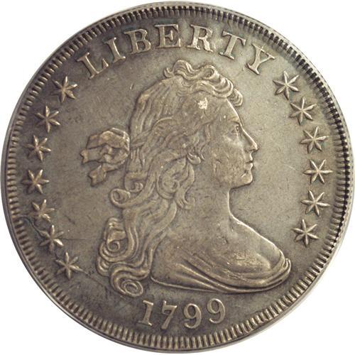 <B>1799 S$1 XF45 PCGS.</B></I> B-19, BB-155, R.5. Die State IV. Curl centered below right edge of E; short bar connects clouds 4 and 5. Only two obverse dies have this particular relationship between the high curl and the letter E, and these dies were each used with two reverse dies. B-14 has a perfect U in UNITED, and a leaf point below the center of I. B-18 has a leaf point under the left upright of I. B-19 also has a leaf point below the left upright of I, and also has a short horizontal bar in the clouds below the E of STATES. B-22 has a broken left serif to U in UNITED. Dusky grayish-brown surfaces with splashes of darker toning with faint bluish verdigris. Both sides have numerous tiny surface nicks.<BR> Many collectors and investors who have entered the market over the past decade have been programmed to purchase Mint State or proof coins of high numeric grades, especially with the advances of the registry programs started by the various grading services. While such programs are certainly wonderful for Morgan dollars or Lincoln cents, few collectors of early silver dollars or other 18th and early 19th century coins can afford such high-level pieces. There are many VF, XF, and AU grade coins available to collectors today, and these pieces will almost certainly prove to be bargains a few years from now. Just a year ago we sold the Jules Reiver collection, and today many collectors wish they had bought many more coins. In January 2008, we expect to hear from others who comment that they should have been more aggressive buying from the Luebke collection.<BR><I>Ex: eBay (1/2006).</B></I><BR><I>From The William Luebke Collection.</B></I><BR><BR><b>Shipping:</b> Coin/Currency (<a target="_blank" href="http://www.heritageauctions.com/common/shipping.php">view shipping information</a>)